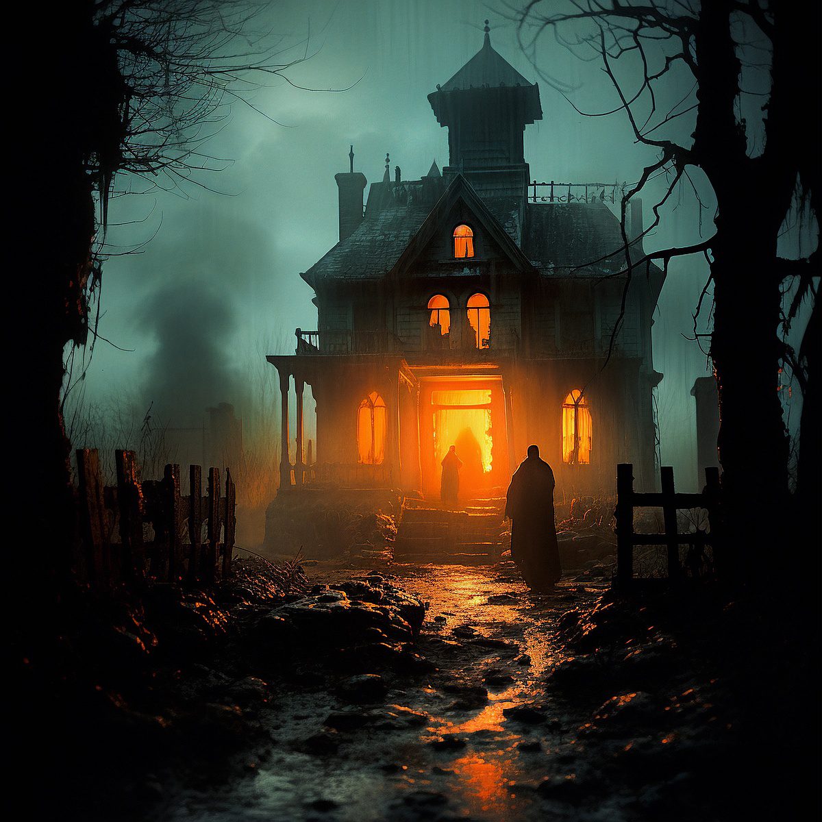 A haunting house stands tall; its timeworn facade echoing tales of yesteryears as a bright orange glow comes from within. In the foreground, a cloaked figure, shrouded in mystery, stands resolute, his intentions unknown. The scene is punctuated by a smaller figure at the home’s entrance and smoke billowing in the distance, hinting at secrets yet to be unveiled.
