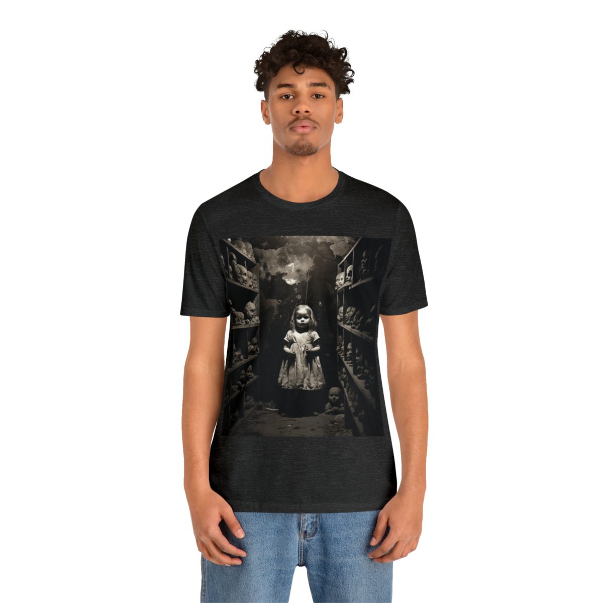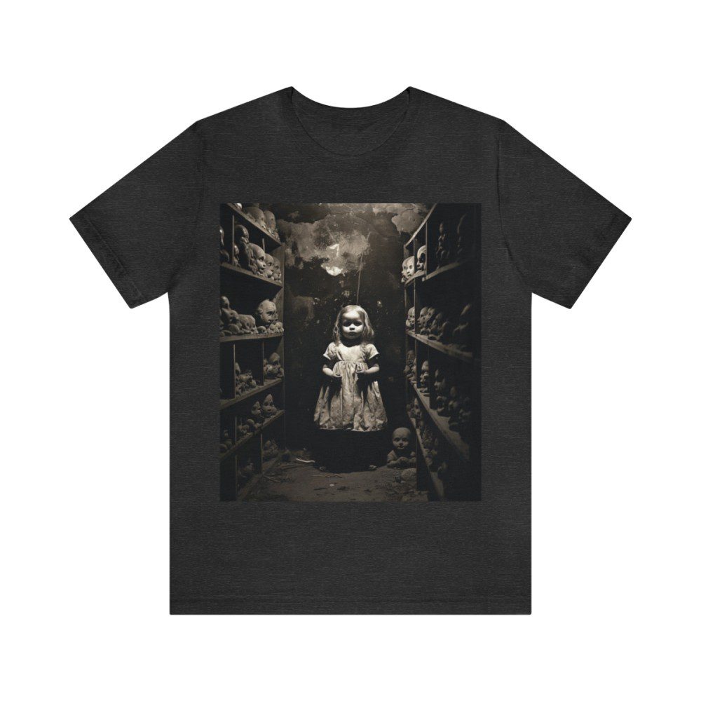 Step into a room where stories linger in the shadows. Amidst the chilling collection of lifeless doll heads, a young girl in an elegant gown stands as a beacon of innocence, her serene gaze a stark contrast to the macabre surroundings. — What stories does this photo (and this shirt) hold?