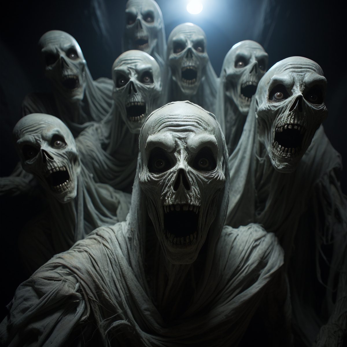In the depths of a pitch-black chamber, a gathering of white skeleton creatures stare towards you, eerily. Bathed in a dim, foreboding light, their bony figures loom large, filling the one exit ahead. You can discern their jagged skulls covered in a wrinkly skin, mouths agape in a silent, eternal scream, and you wonder if you’ll make it out alive!