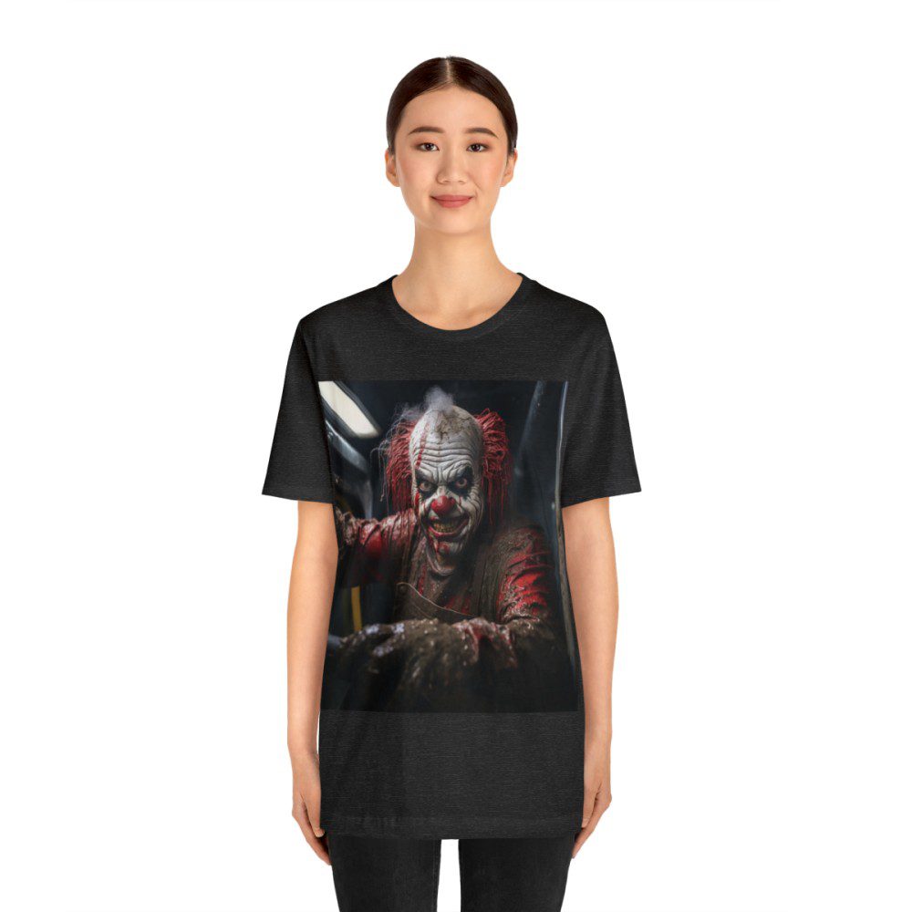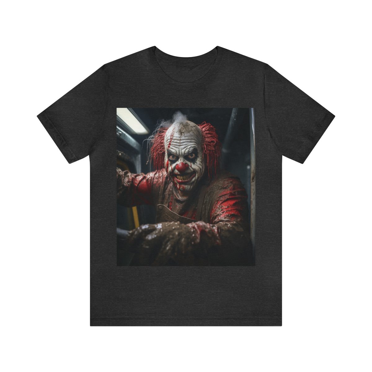 Hop in and buckle up for a wild ride with our messy, evil clown! Fresh from a mud-slinging (we hope!) adventure, this vibrant clown, decked out in a gooey, slimy, ooze covered suit, is all set to hit the road as he meets you in a car wash! But wait, did he just finish a performance or get into a sewer fight or worse? — With this shirt, you’re not just wearing a design; you’re donning a story that’s bound to get some laughs and stares. So, get ready for some conversational slapstick fun everywhere ya go!