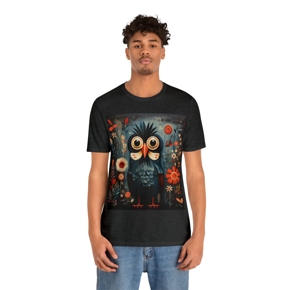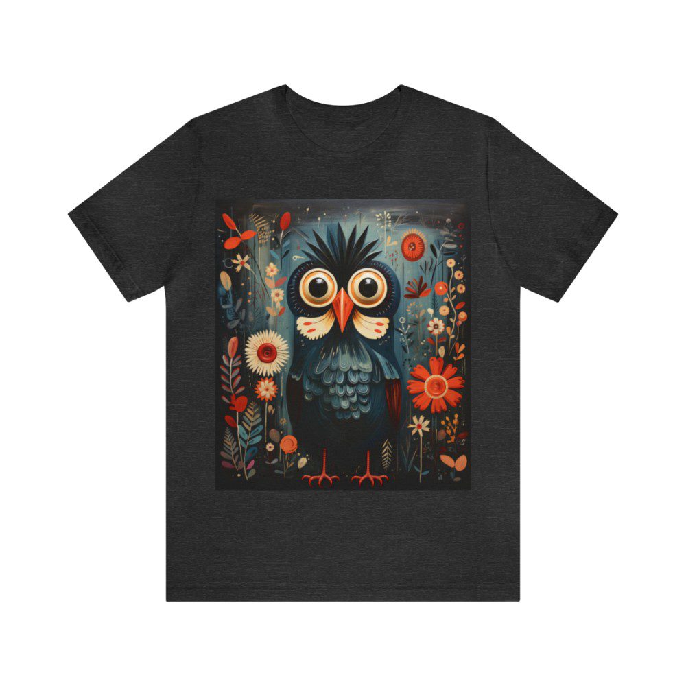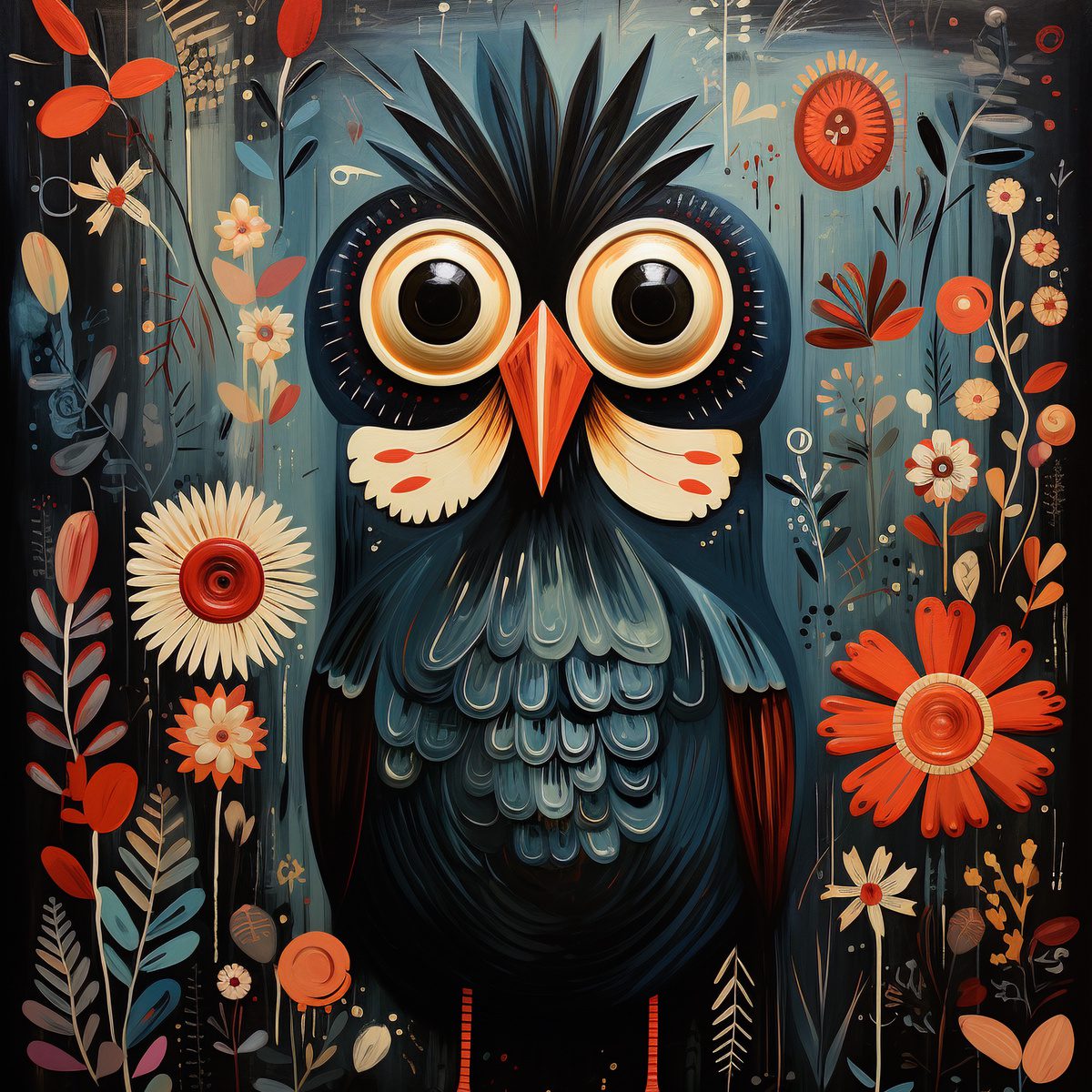 With hues reminiscent of autumn and the enchanting allure of twilight, a majestic owl stands as the sentinel amidst a field of flowers. The owl, with its deep, soulful eyes, acts as a magnetic centerpiece of this tableau, drawing you into the very essence of its mystical realm.