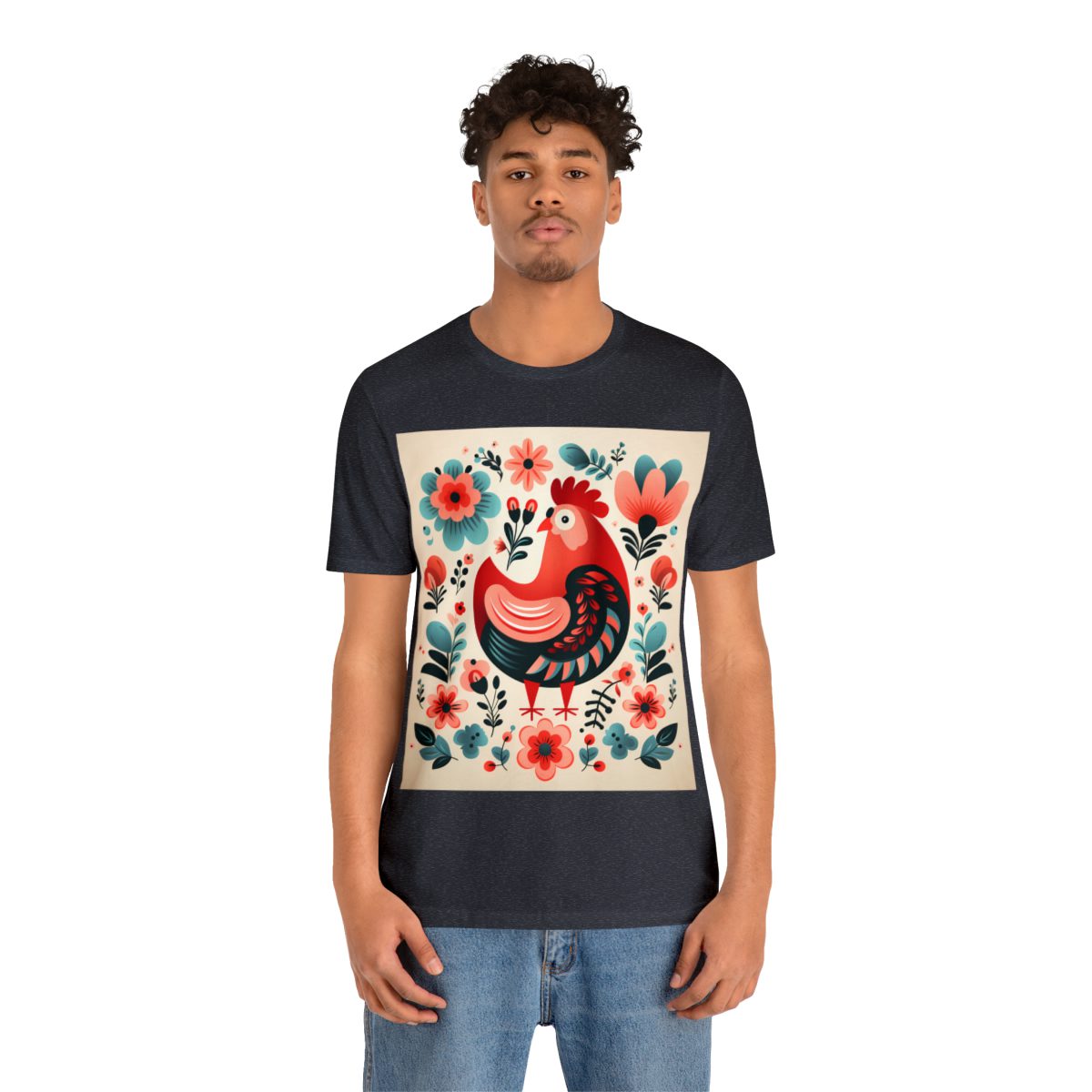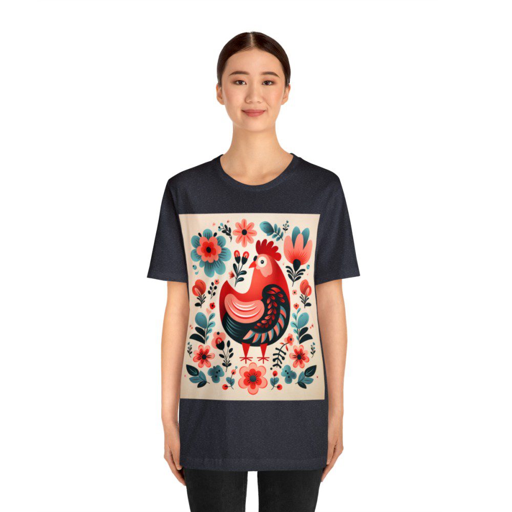 Transport yourself back to the enchanting era of the 1950s with this whimsical chicken. With bright, complementary colors in the iconic style of the mid-20th century, this adorable clucker finds herself surrounded by flowers, and this shirt will have you reminiscing about the golden age of yesteryear with everyone you meet.