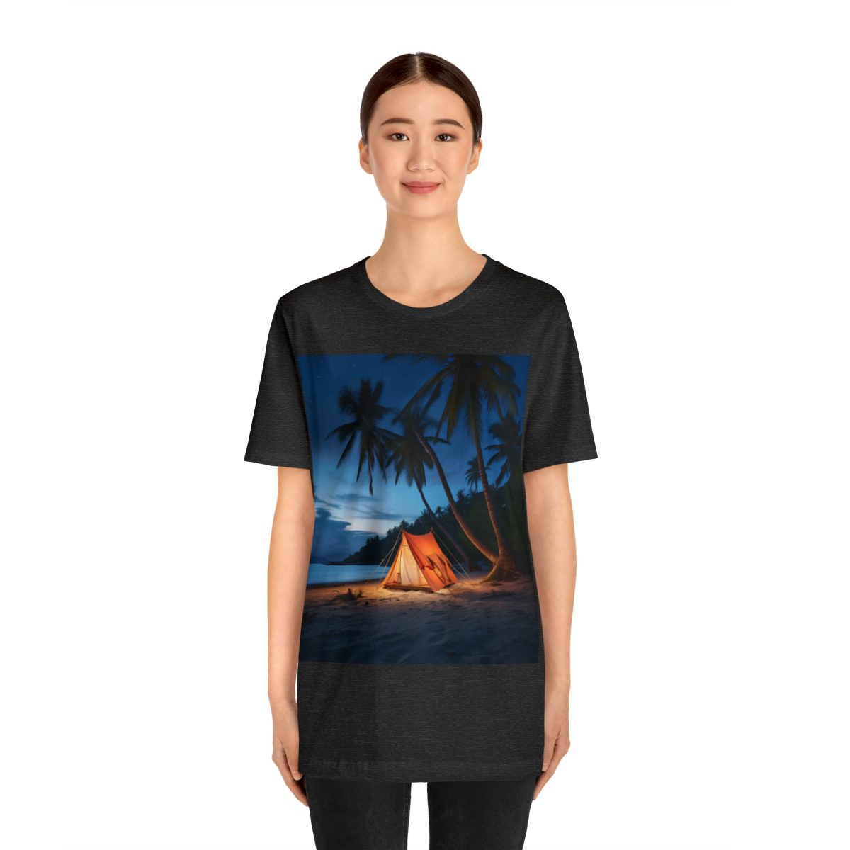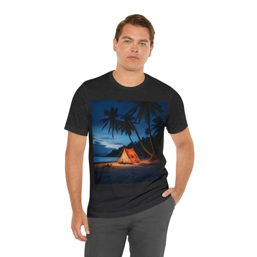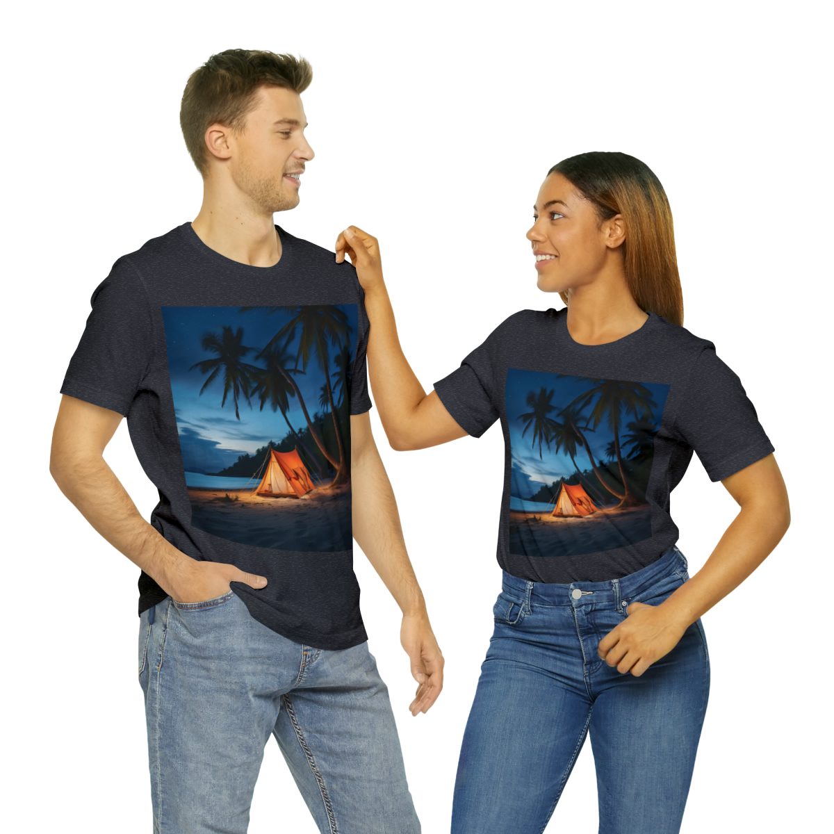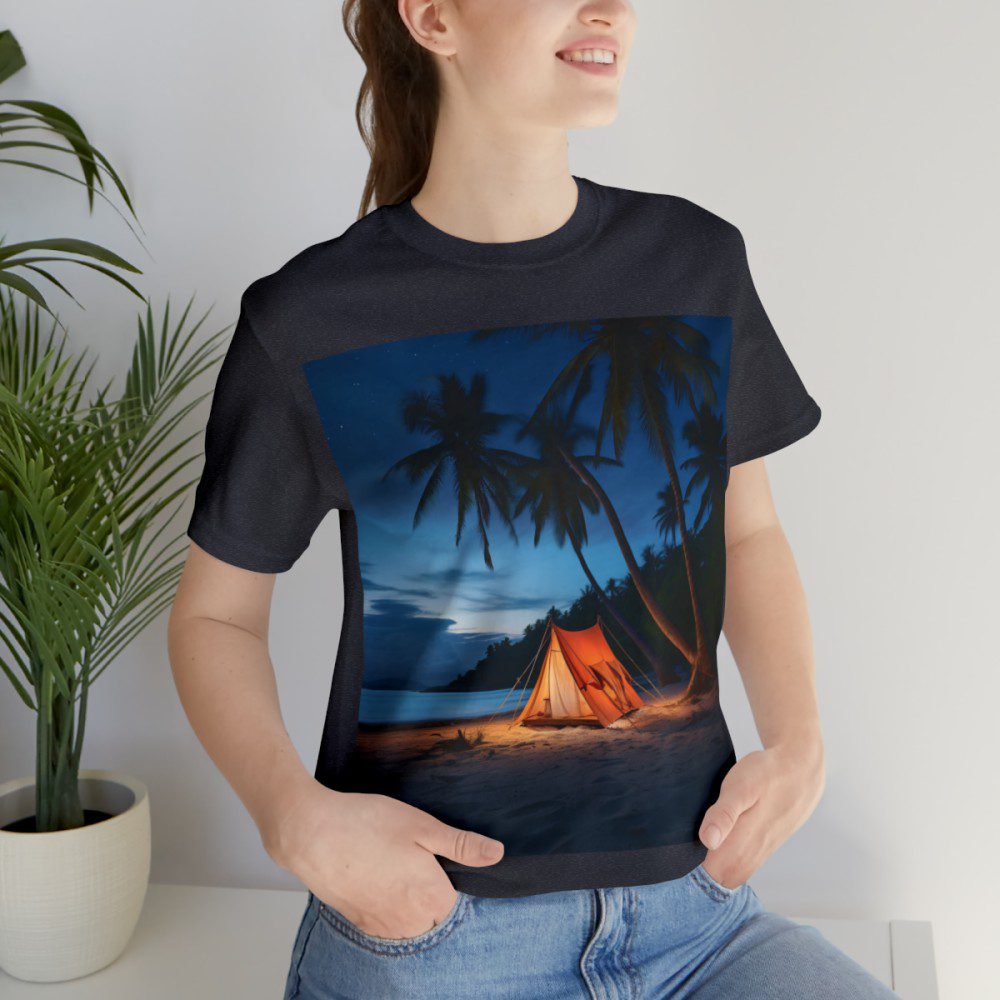 Immerse yourself in the magic of moonlight with this captivating, serene beach scene. Feel the gentle sway of the tall palm trees, each one telling tales of tropical escapes and moonlit dances. With this shirt, you’re not just wearing a scene; you’re embracing a dreamy getaway, inviting everyone to join you on an enchanting journey.