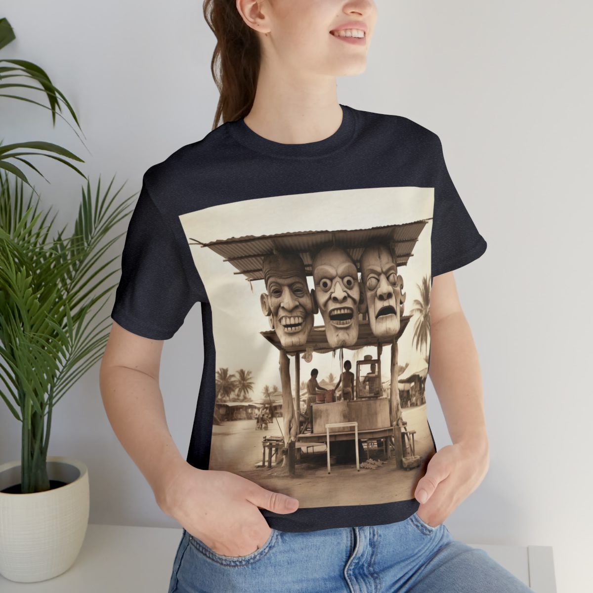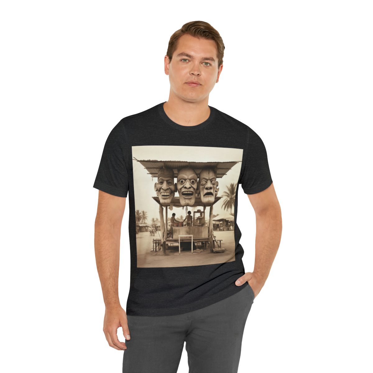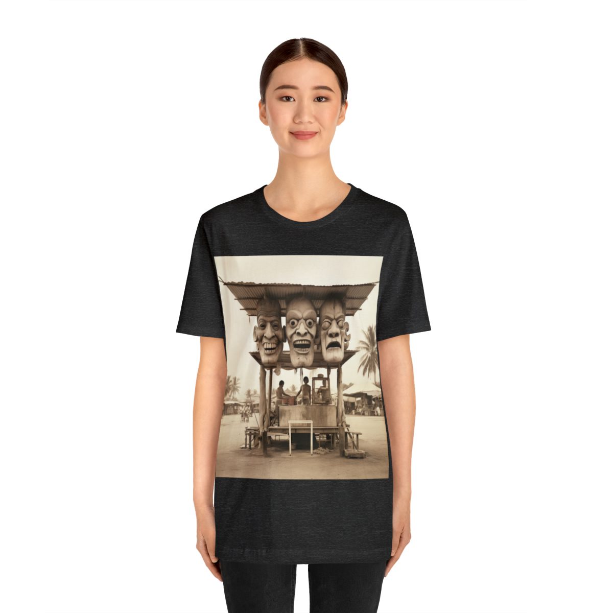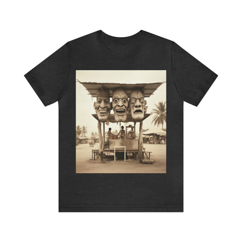 Three giant carved-wood masks serve as the signage for this vintage tiki tourist concession hut. Walk on up, grab a coconut drink, and enjoy your time in the tropical weather.